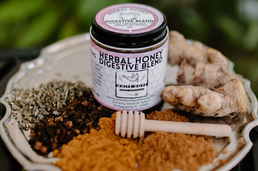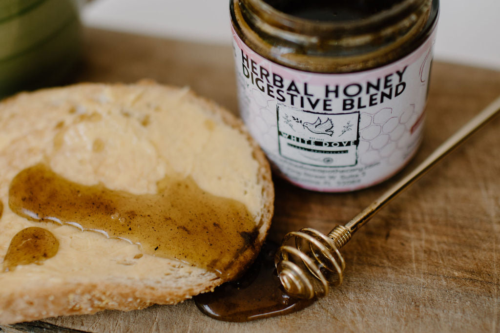 Combining raw honey with medicinal herbs results in an electuary in the land of Herbalism. On its own raw honey is bountifully nutritious. When infused with medicinal herbs it soaks in all the nutrients and essential oils from the herb. It’s a tasty method to nurture and bolster and balance the body’s digestive system. This gentle, yet effective, honey is great for those "going" too much or too little, or for anyone who suffers from tummy aches after eating.